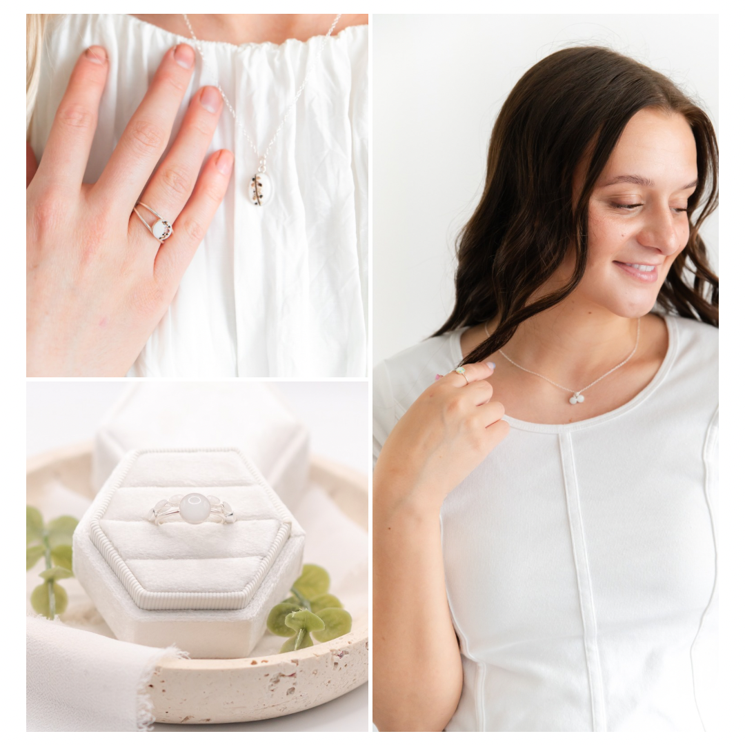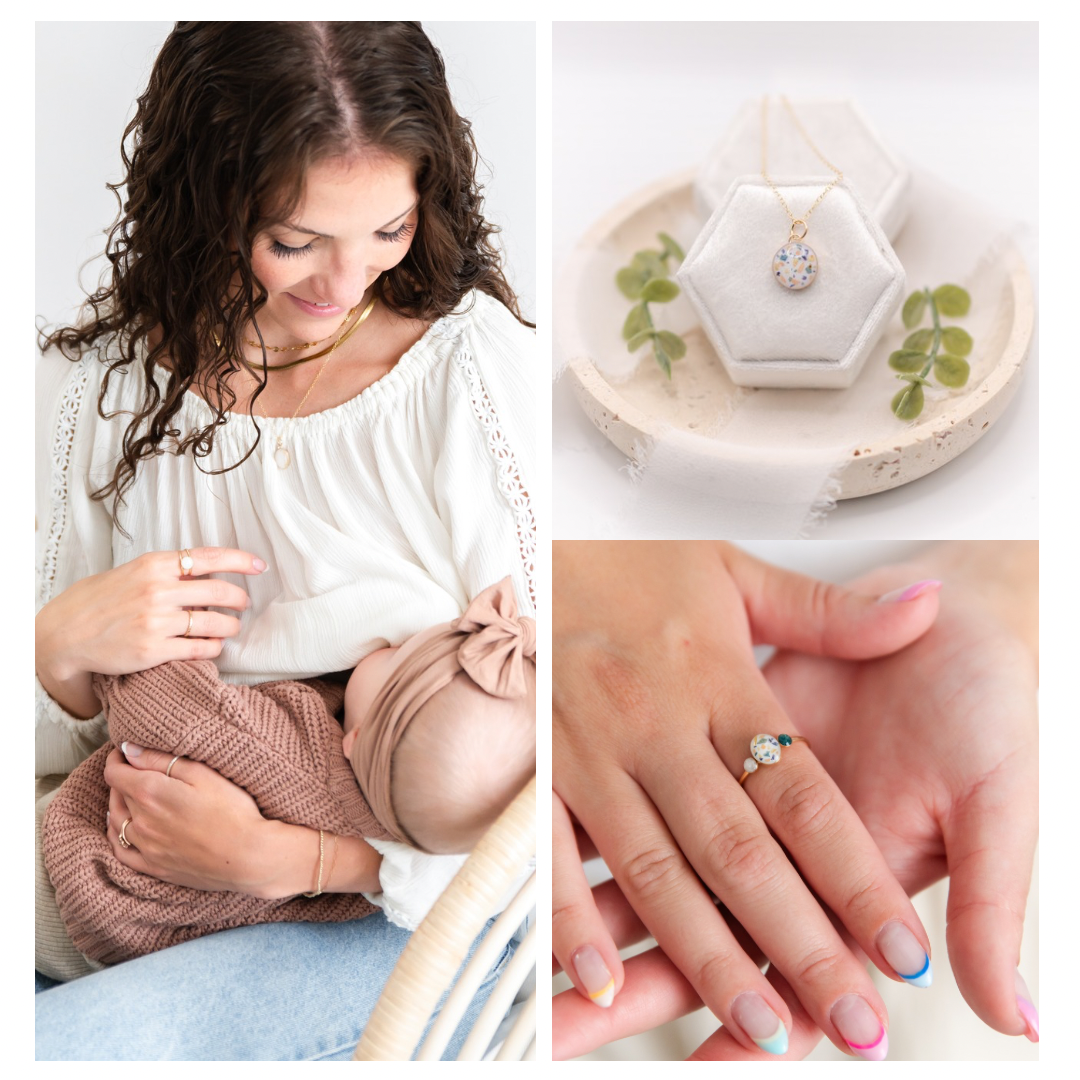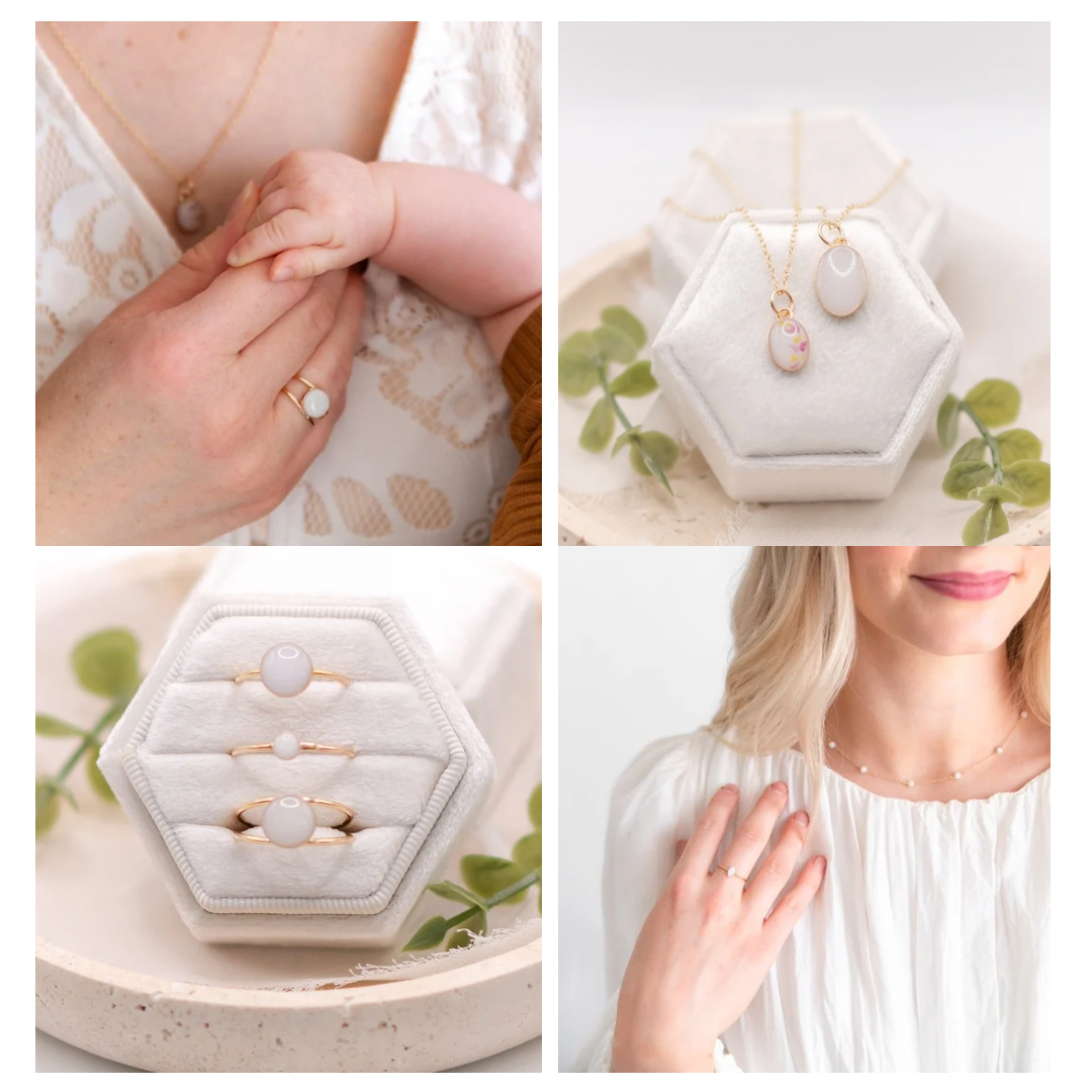 Whether you are wanting to celebrate your breastfeeding journey, honor a loved one and hold them close with you, remember your baby who you lost too soon, cherish your wedding day, or wear your favorite place with you always, I can create a beautiful timeless keepsake for you! Once you place your order, you send me an ounce of breastmilk, a portion of cremation ashes, a pregnancy test cap, your wedding flowers, or an item (sand, dirt, leaf, etc) from your favorite place and I create your stunning piece to send back to you.